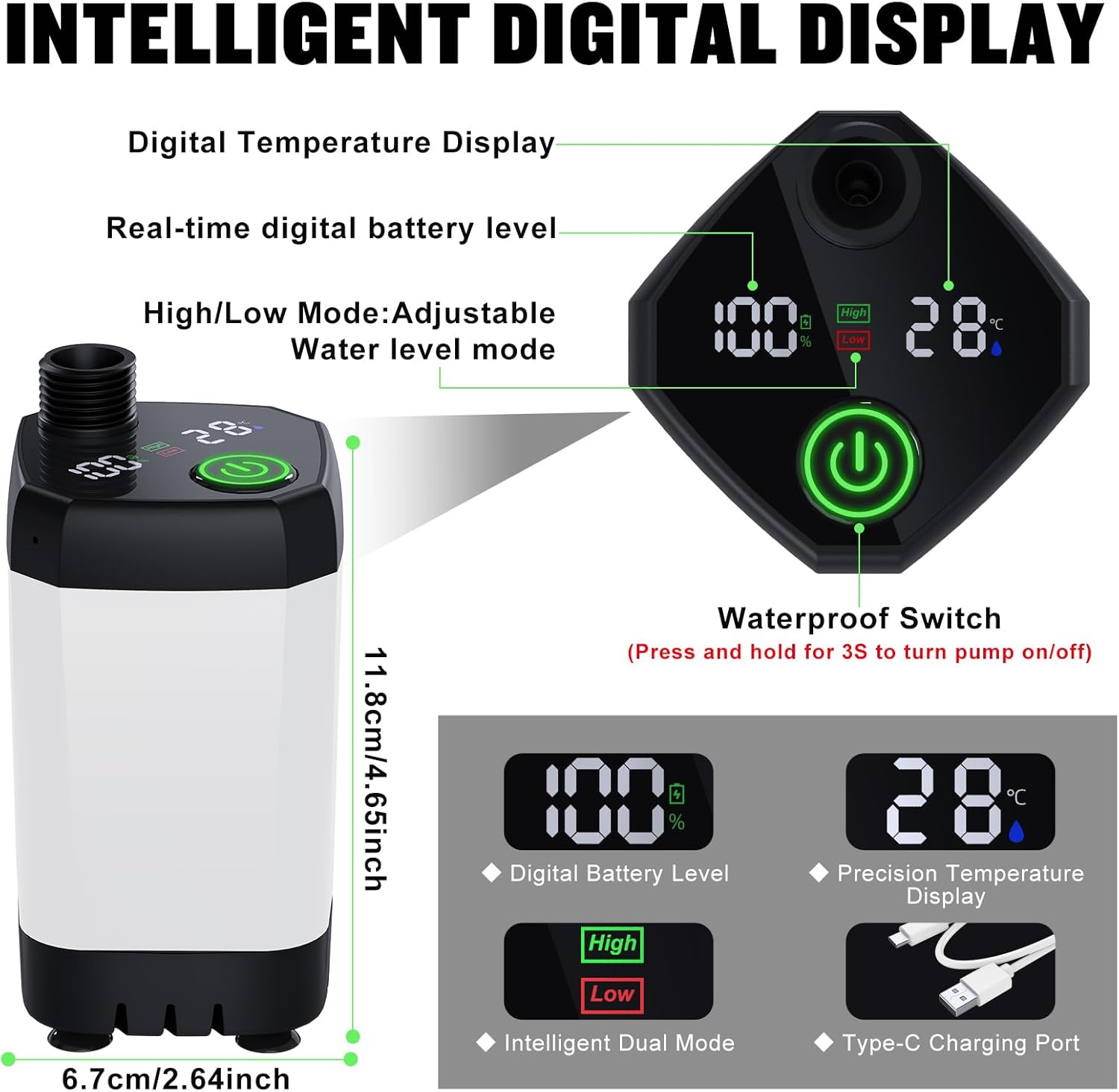 【No Heating Function】【Extended Battery Life】 With a long-lasting 6000mAh battery capacity, our camp shower pump can work continuously for 120-150 minutes. Plus, its Type C interface allows for convenient mobile charging such as mobile phone charger (5V 0.5-2A), mobile power, laptop or car USB output charging. The port comes with a silicone waterproof cover for safe use.