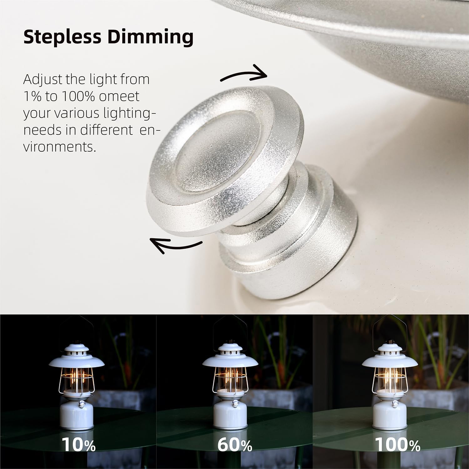 【Stepless Dimming & High Brightness】This vintage camping lantern adopts a convenient rotary switch design, allowing you to easily switch between soft glow and dazzling 1000 lumens lighting. The adjustable brightness (1-100%) function allows you to customize the amount of light according to the specific situation, and the stepless dimming brightness can meet any brightness needs.