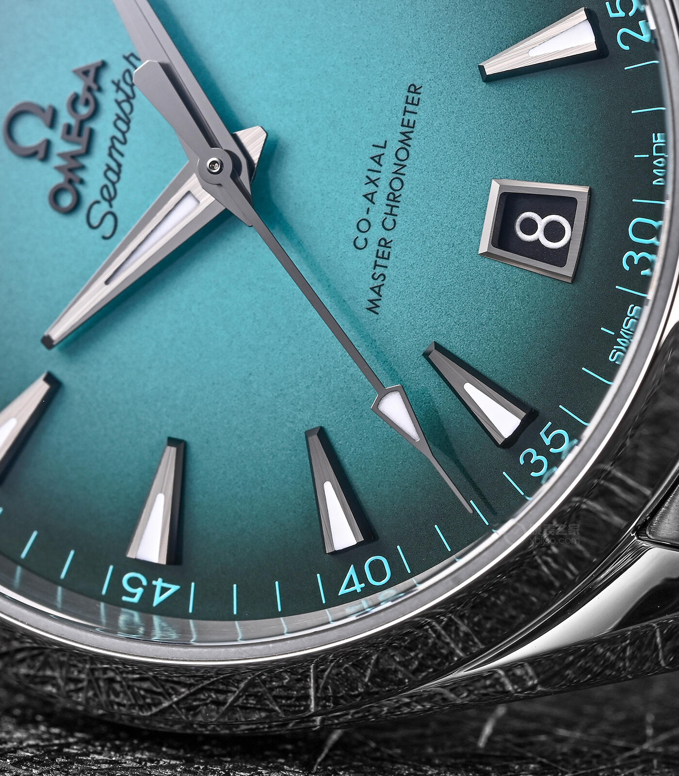 The Omega Seamaster Aqua Terra 150M Turquoise watch, model 220.10.41.21.03.006, has a 41mm case diameter, is made of stainless steel, and features a gradient turquoise lacquered dial with grey PVD hands and Super-LumiNova luminous markers for excellent legibility in low light.