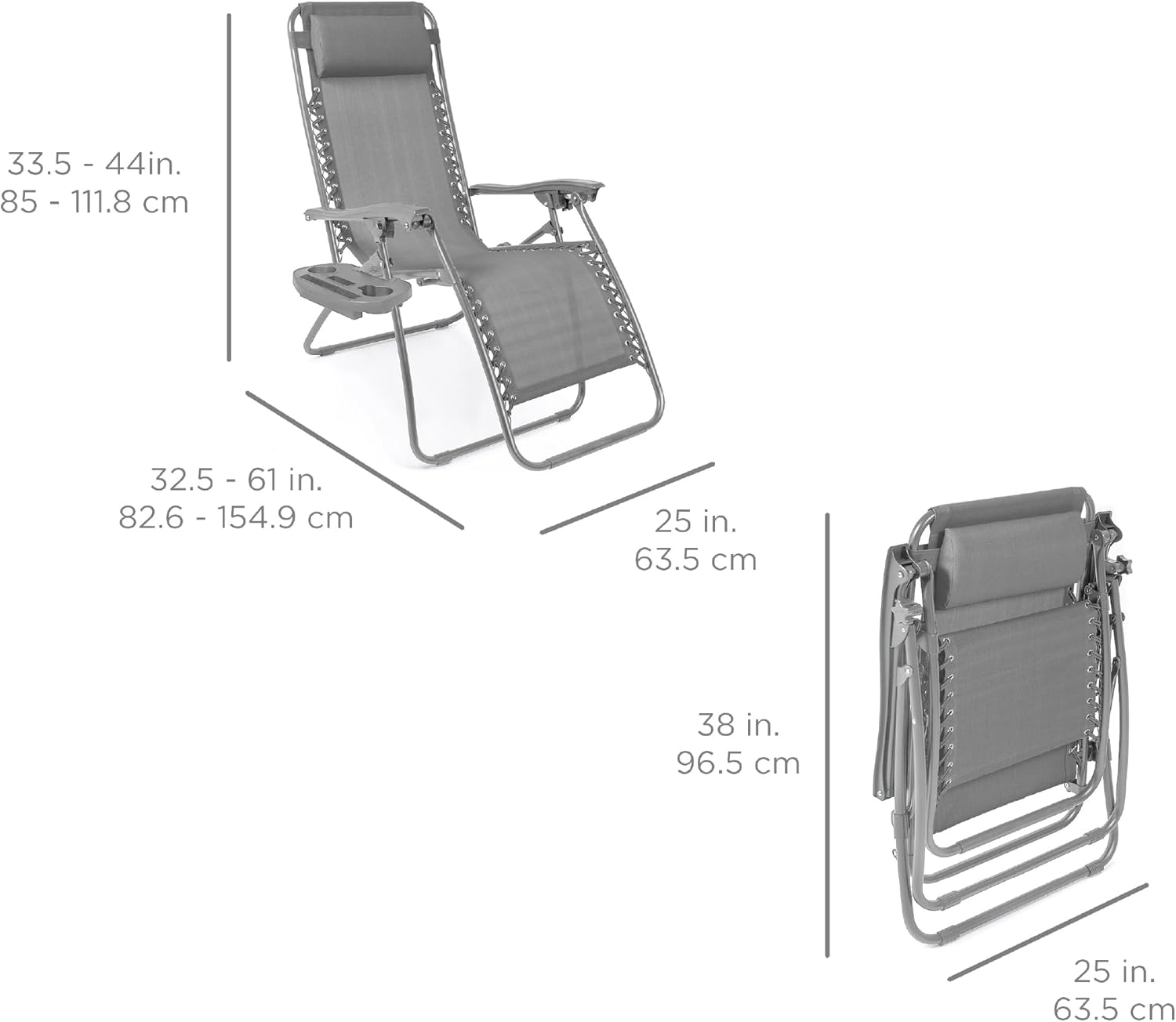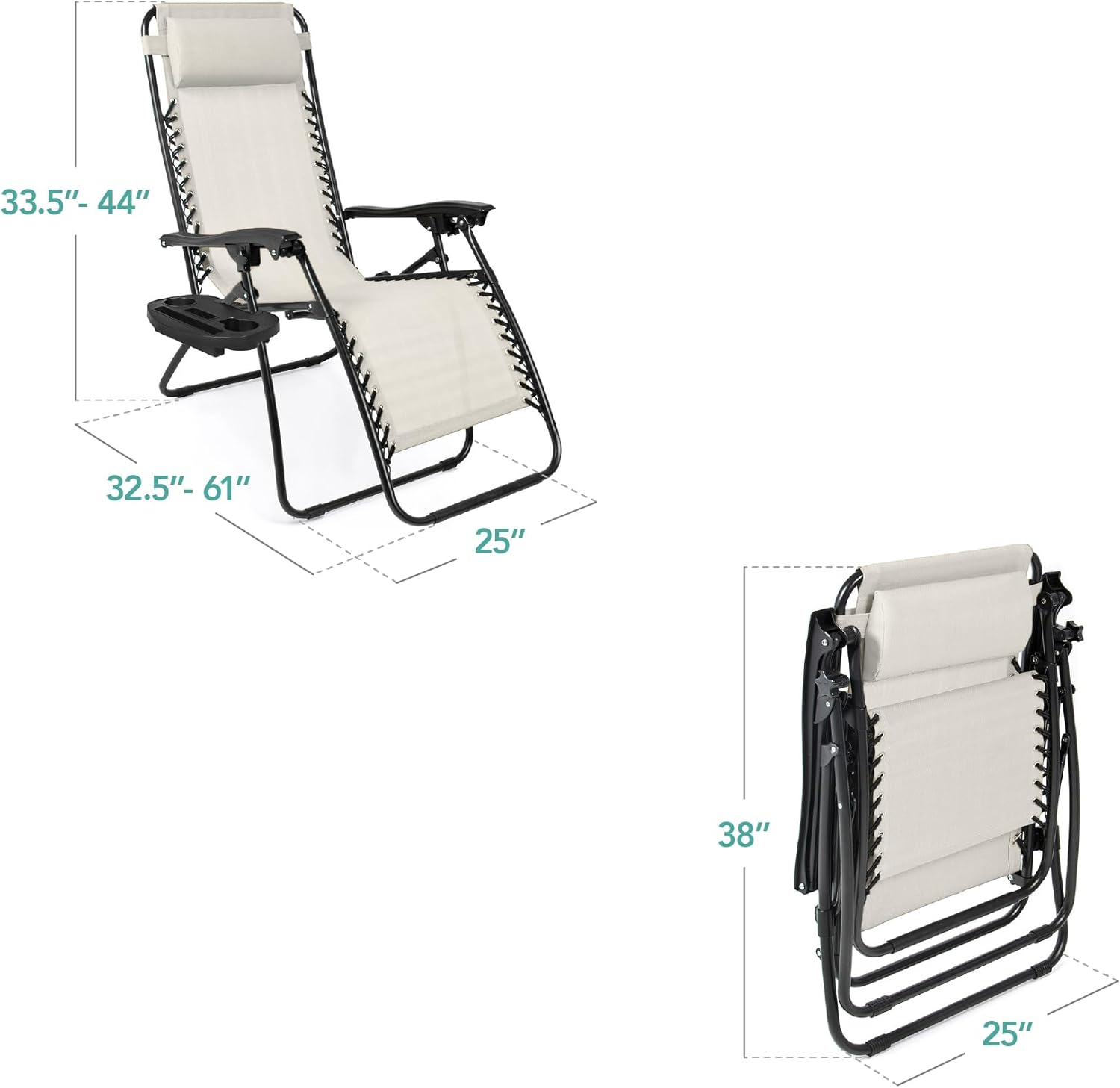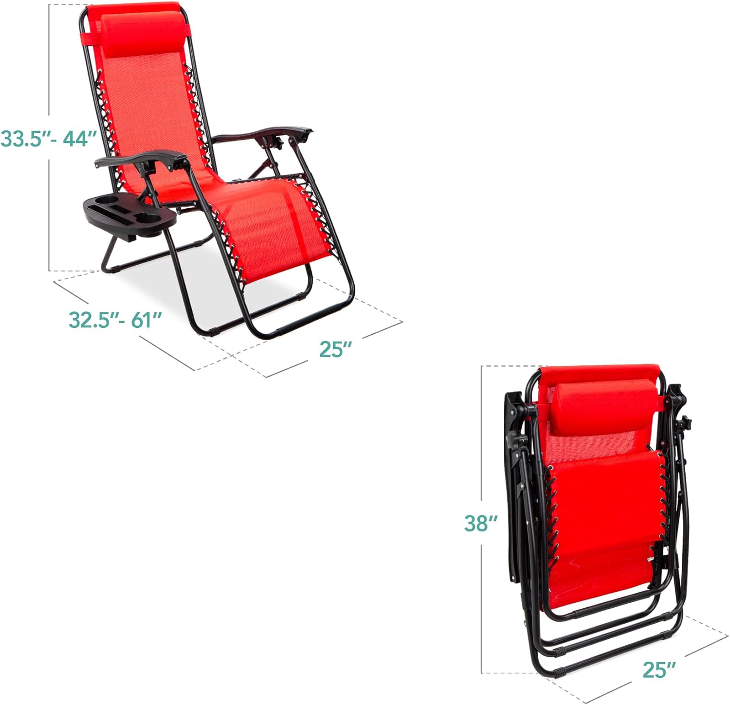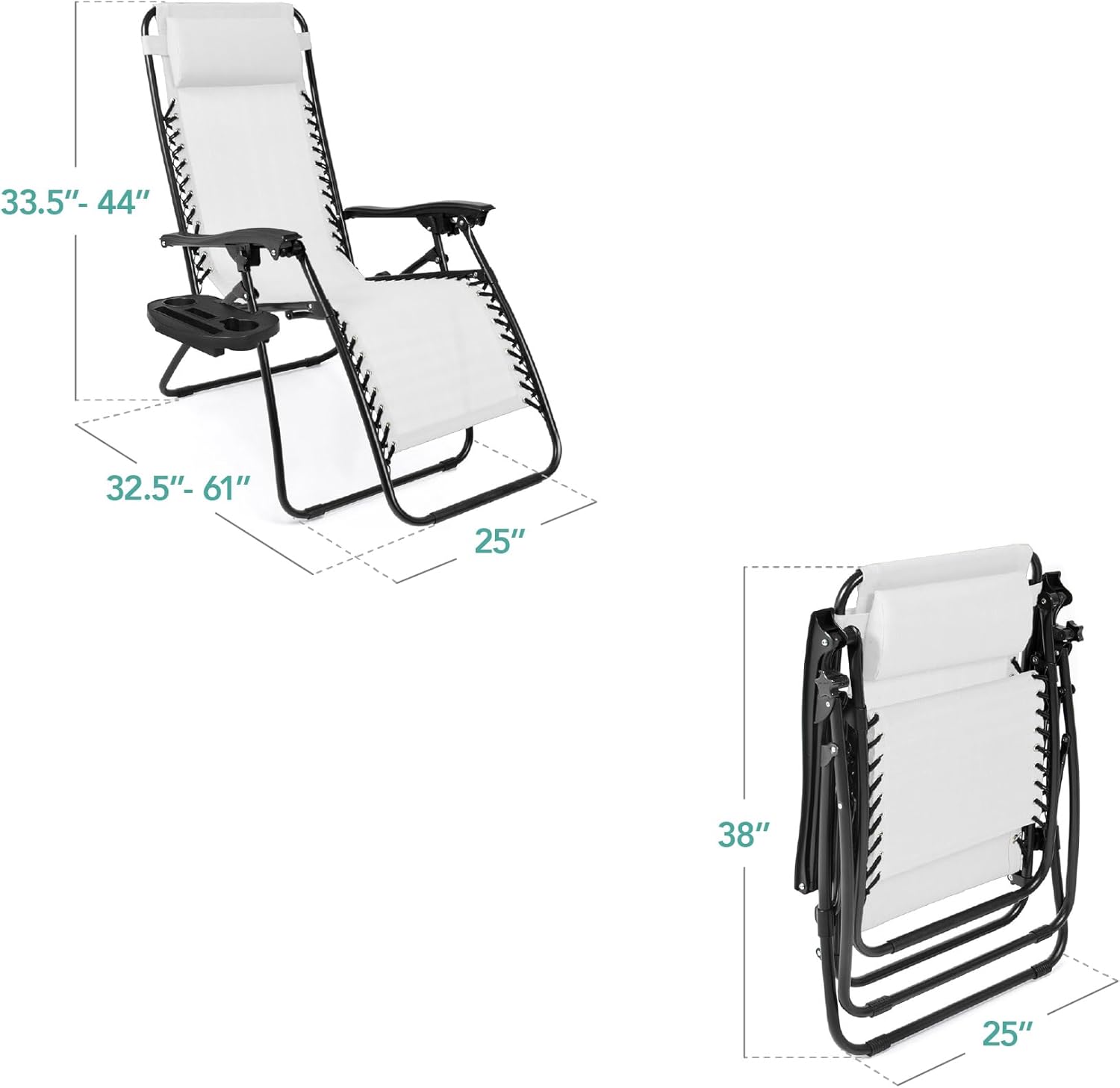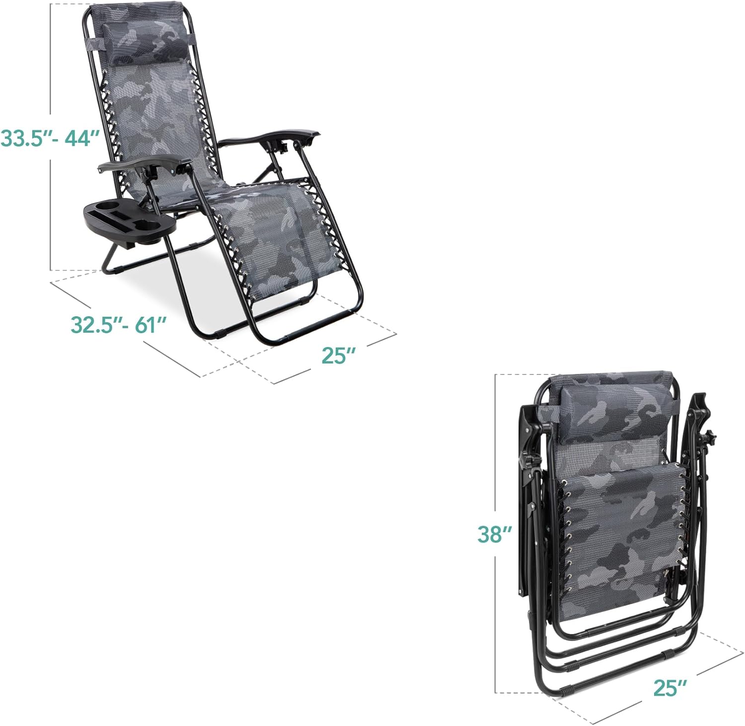 REMOVABLE, ADJUSTABLE HEADRESTS: Includes a removable, padded headrest for an extra element of adjustable comfort; OPEN DIMENSIONS: 32.5"-61"(L) x 25"(W) x 33.5"-44"(H); FOLDED DIMENSIONS: 38"(L) x 25"(W) x 6"(H); WEIGHT CAPACITY: 250 lbs.