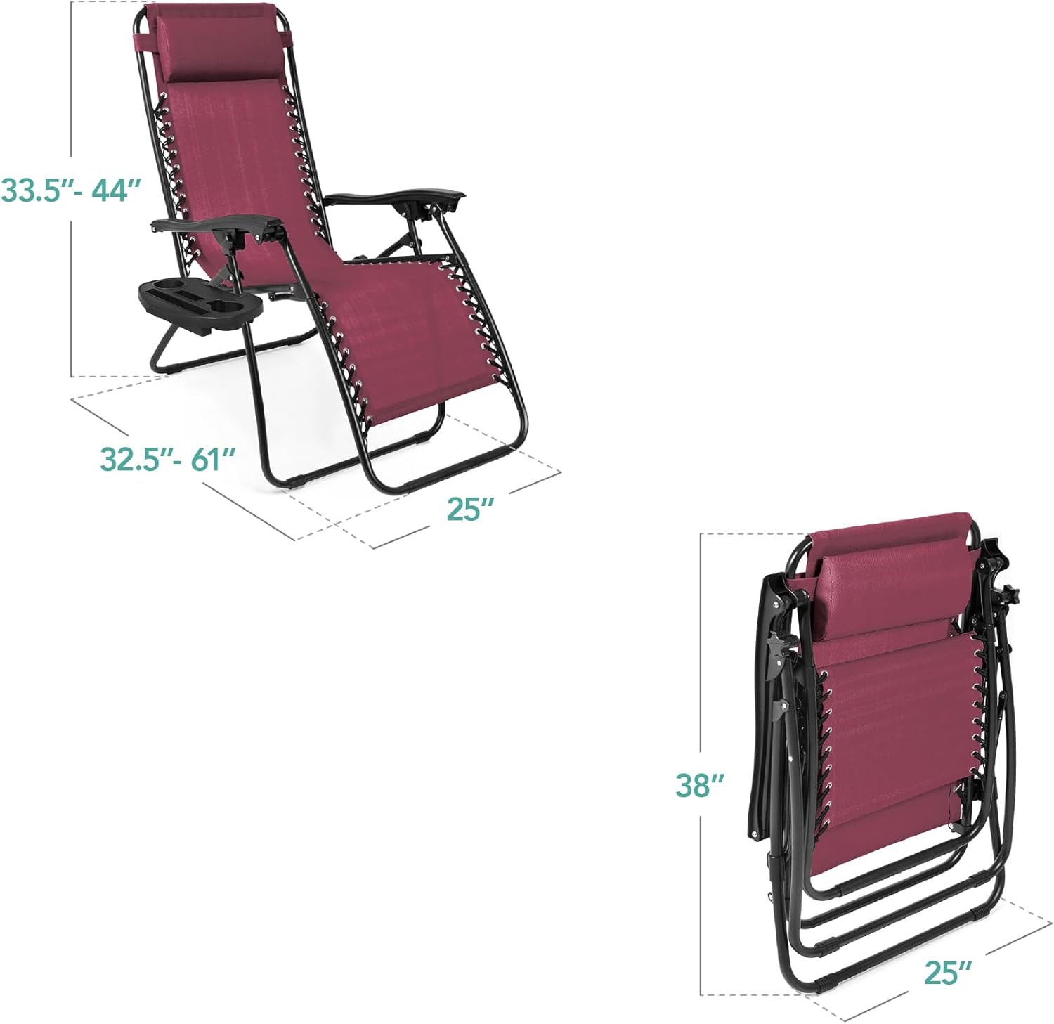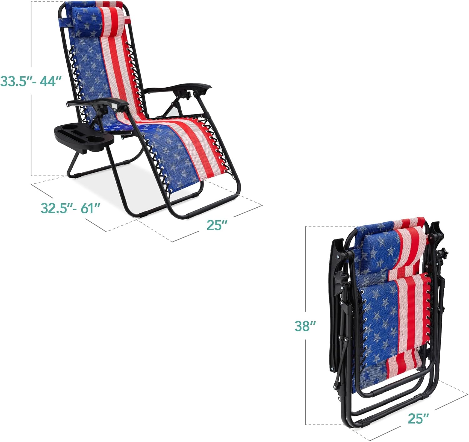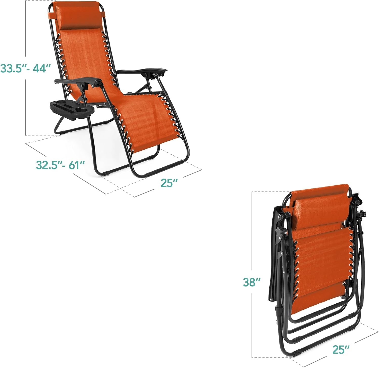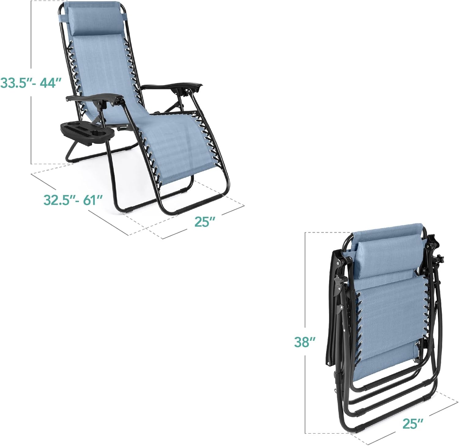 REMOVABLE, ADJUSTABLE HEADRESTS: Includes a removable, padded headrest for an extra element of adjustable comfort; OPEN DIMENSIONS: 32.5"-61"(L) x 25"(W) x 33.5"-44"(H); FOLDED DIMENSIONS: 38"(L) x 25"(W) x 6"(H); WEIGHT CAPACITY: 250 lbs.