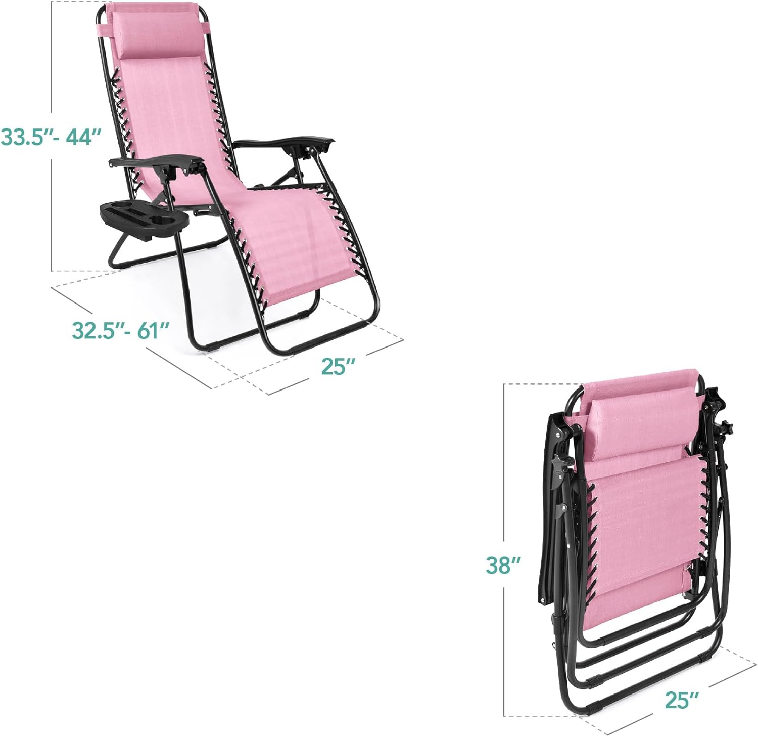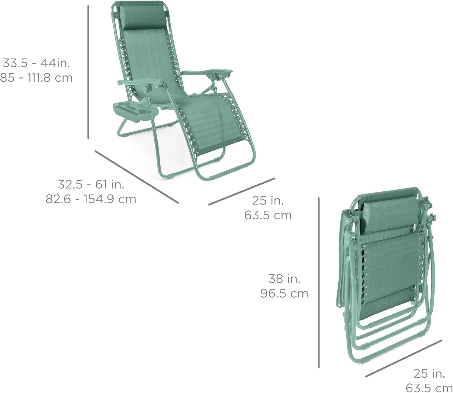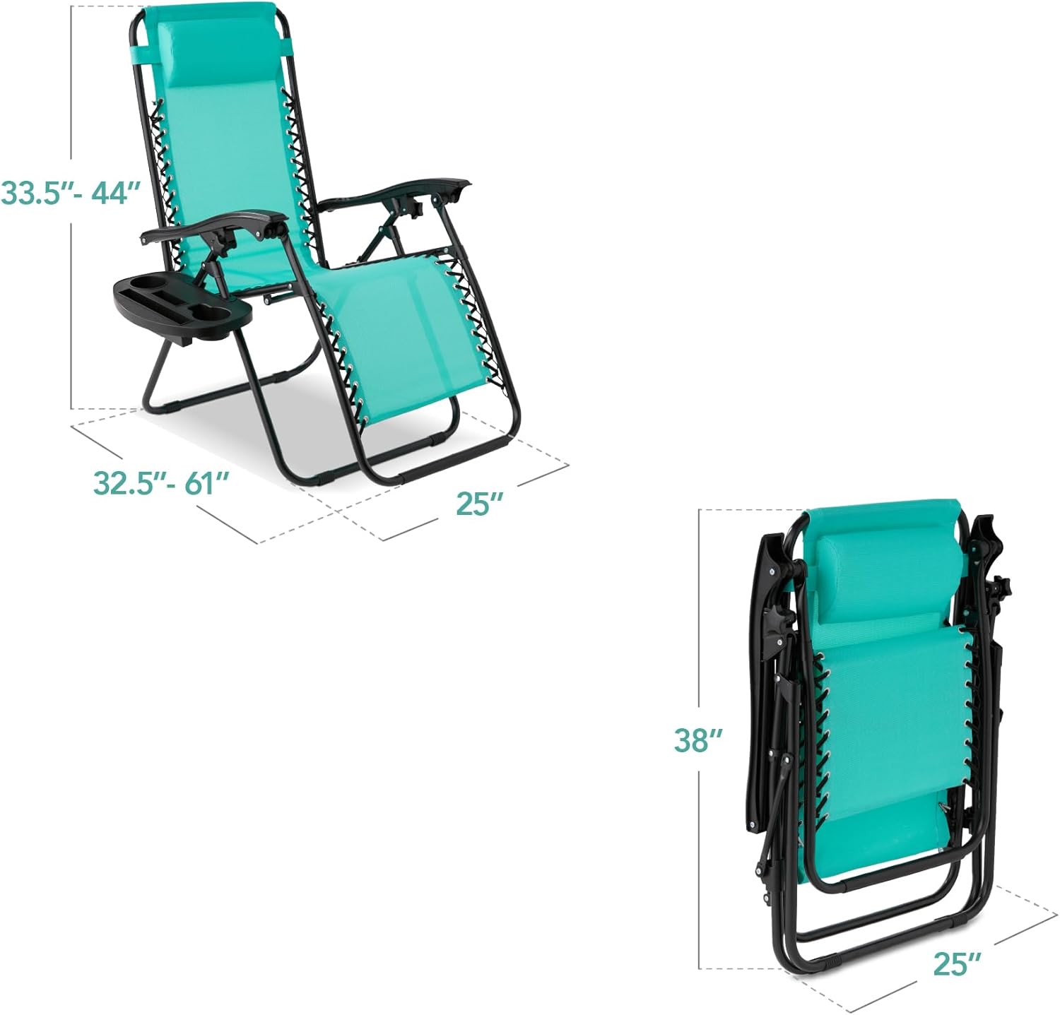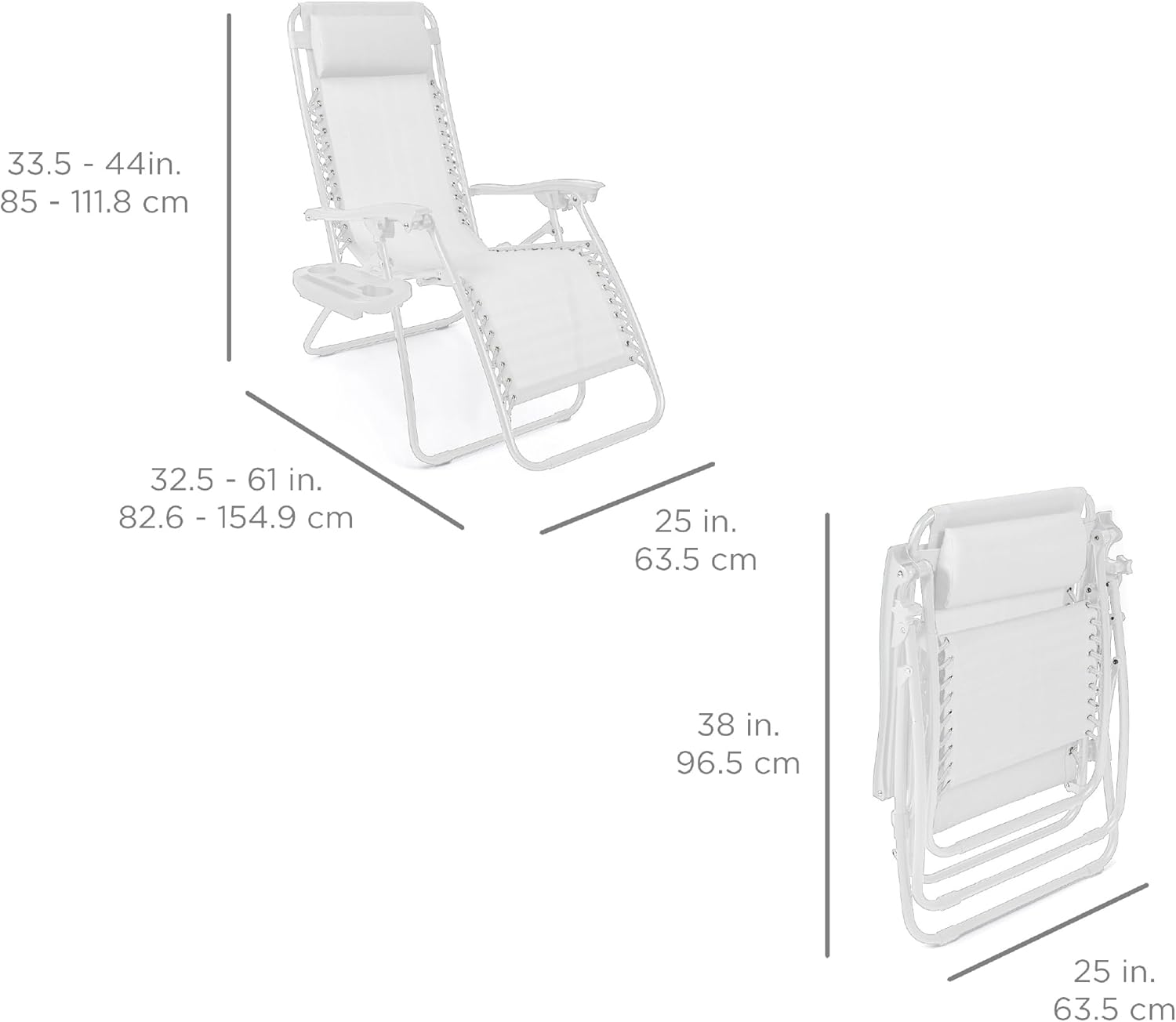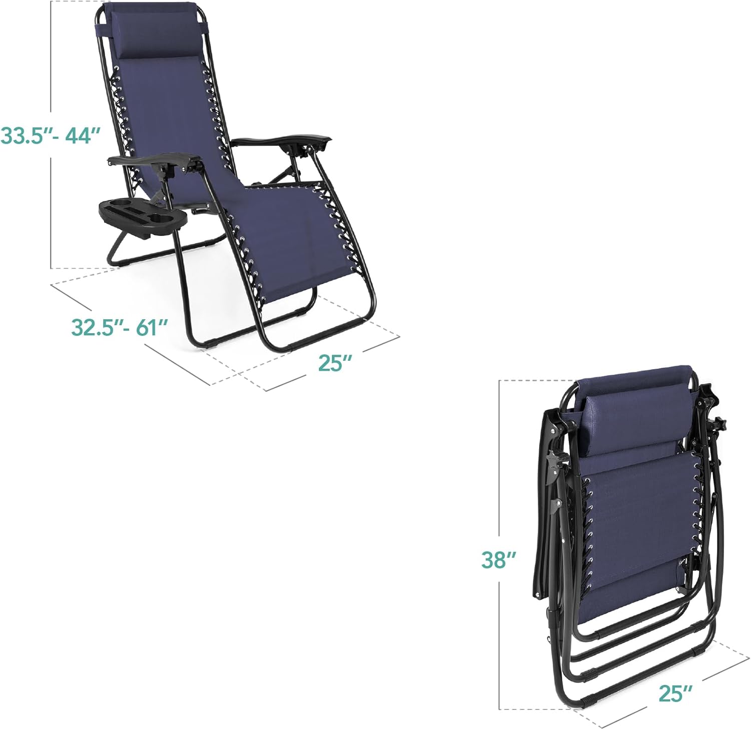 REMOVABLE, ADJUSTABLE HEADRESTS: Includes a removable, padded headrest for an extra element of adjustable comfort; OPEN DIMENSIONS: 32.5"-61"(L) x 25"(W) x 33.5"-44"(H); FOLDED DIMENSIONS: 38"(L) x 25"(W) x 6"(H); WEIGHT CAPACITY: 250 lbs.