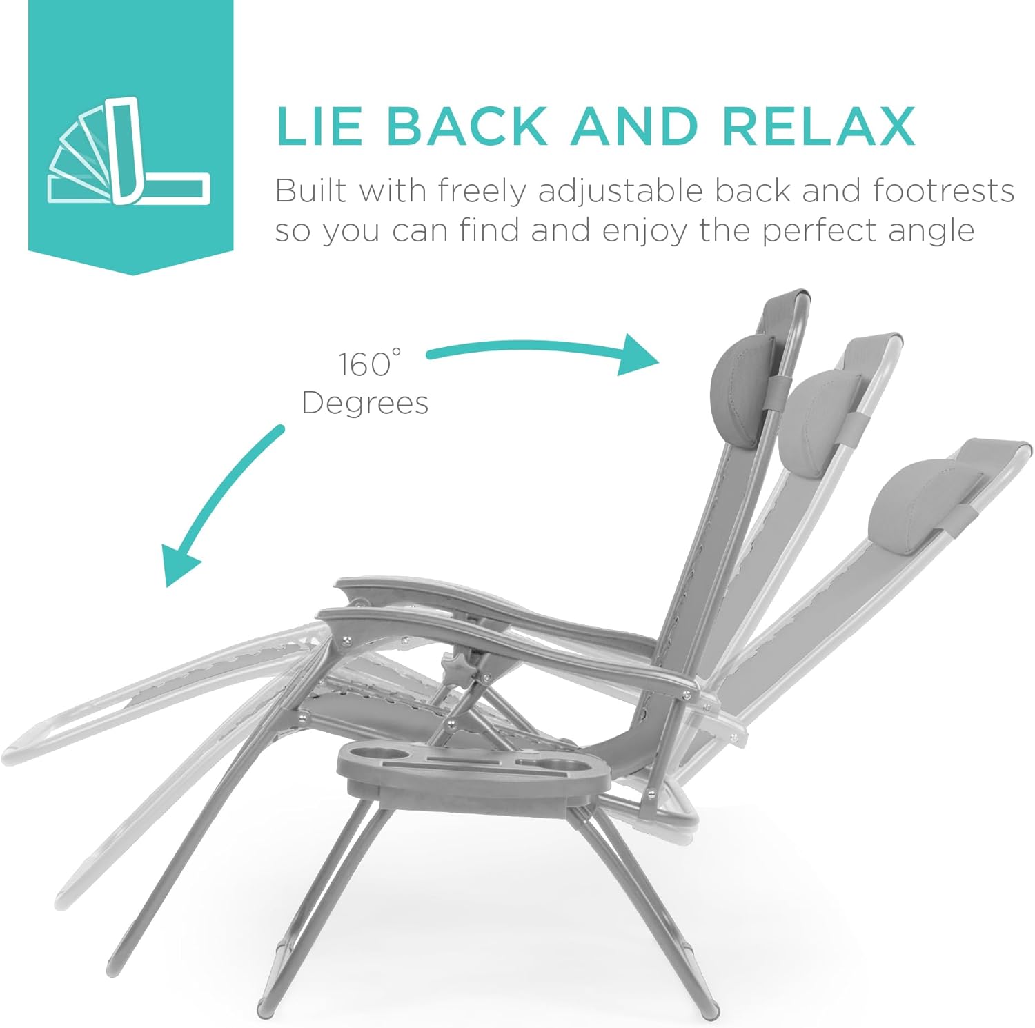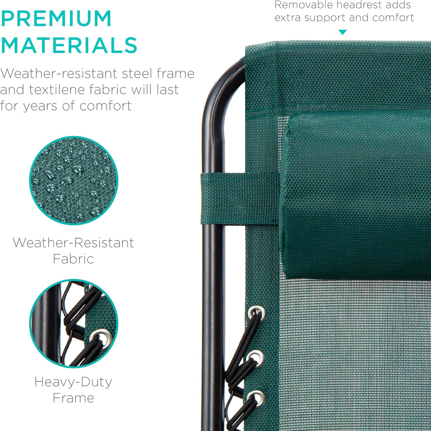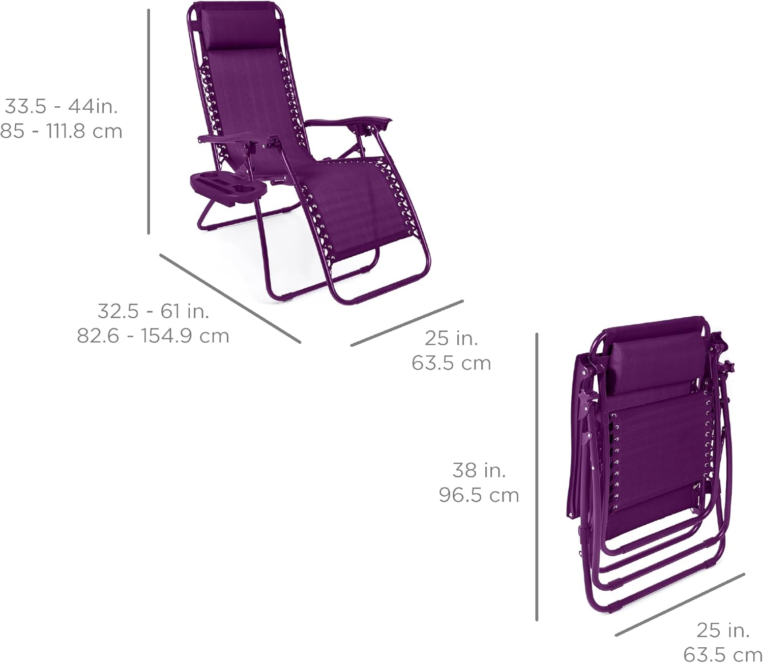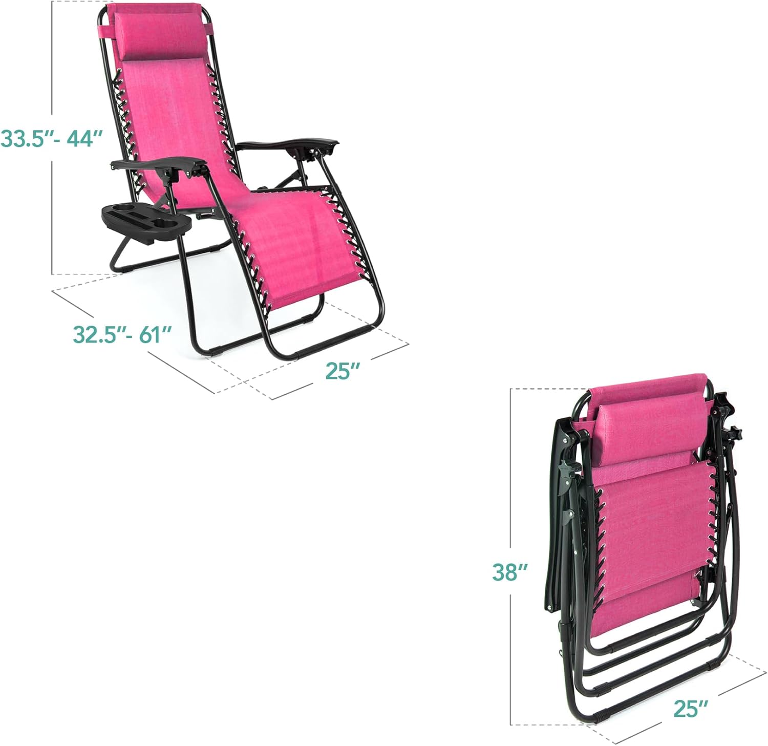 REMOVABLE, ADJUSTABLE HEADRESTS: Includes a removable, padded headrest for an extra element of adjustable comfort; OPEN DIMENSIONS: 32.5"-61"(L) x 25"(W) x 33.5"-44"(H); FOLDED DIMENSIONS: 38"(L) x 25"(W) x 6"(H); WEIGHT CAPACITY: 250 lbs.