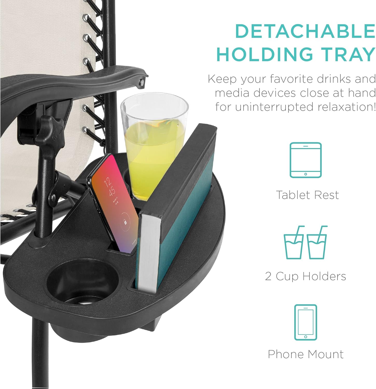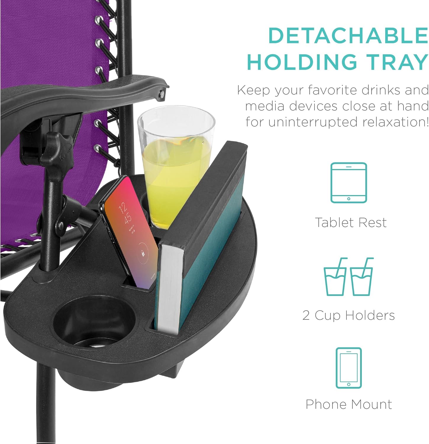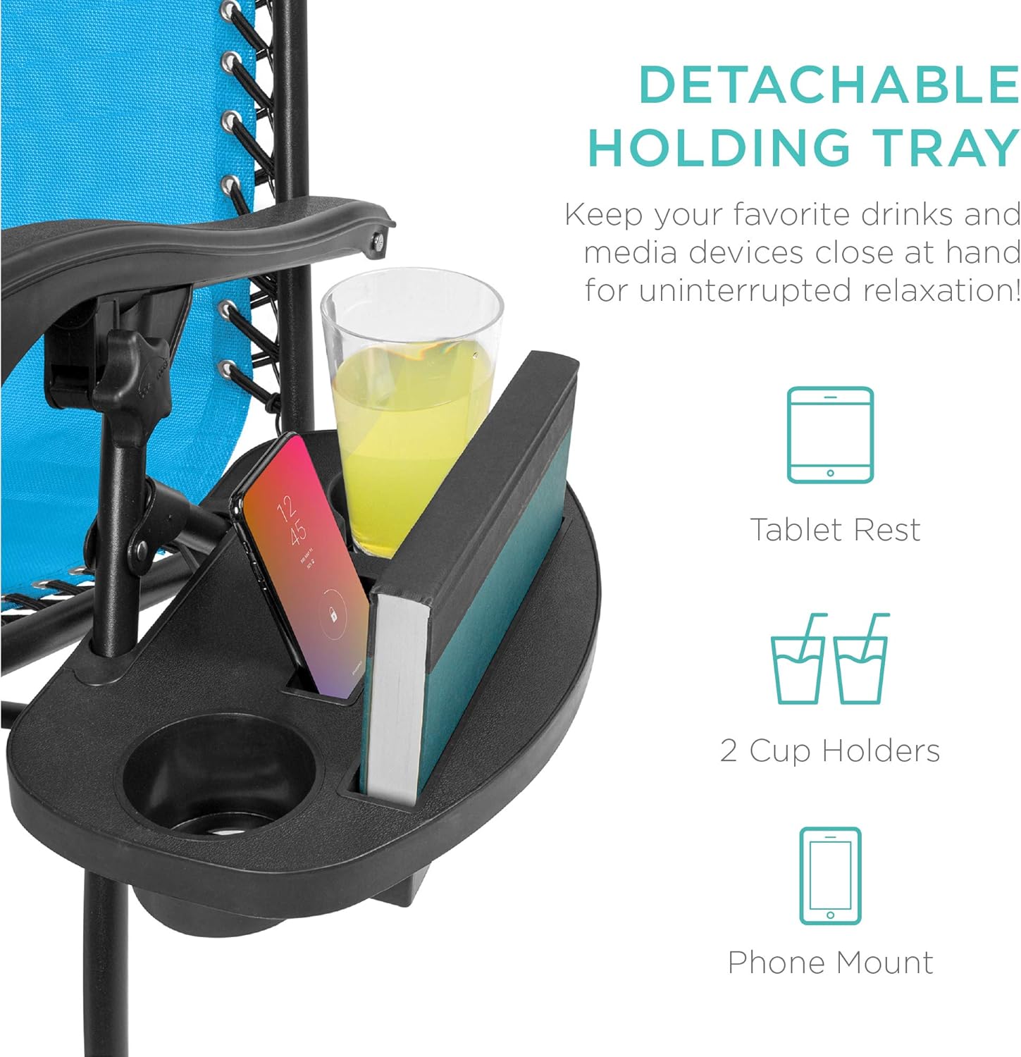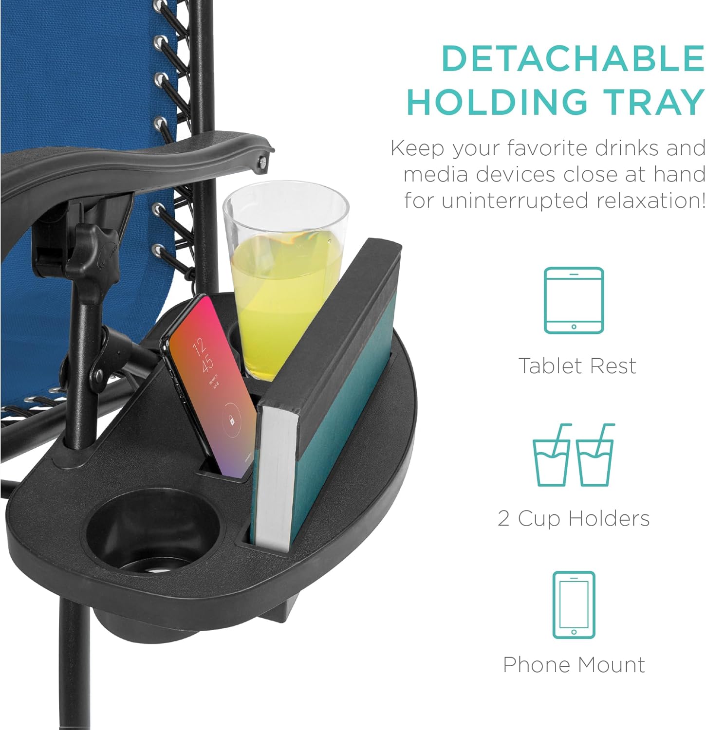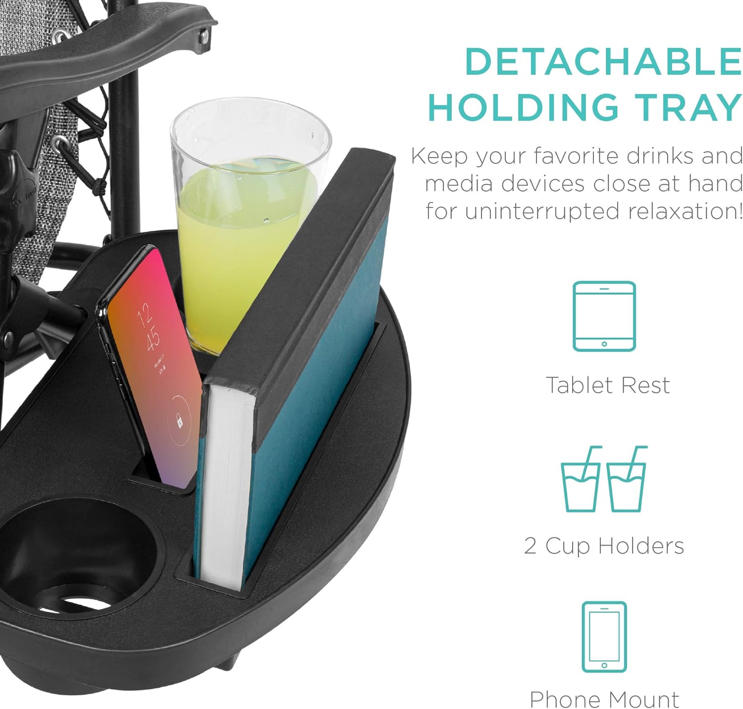 CONVENIENT & DETACHABLE TRAY: Removable tray is built with two cup holders, a phone holder, and a tablet holder so you never have to be far from your favorite drinks or media devices!