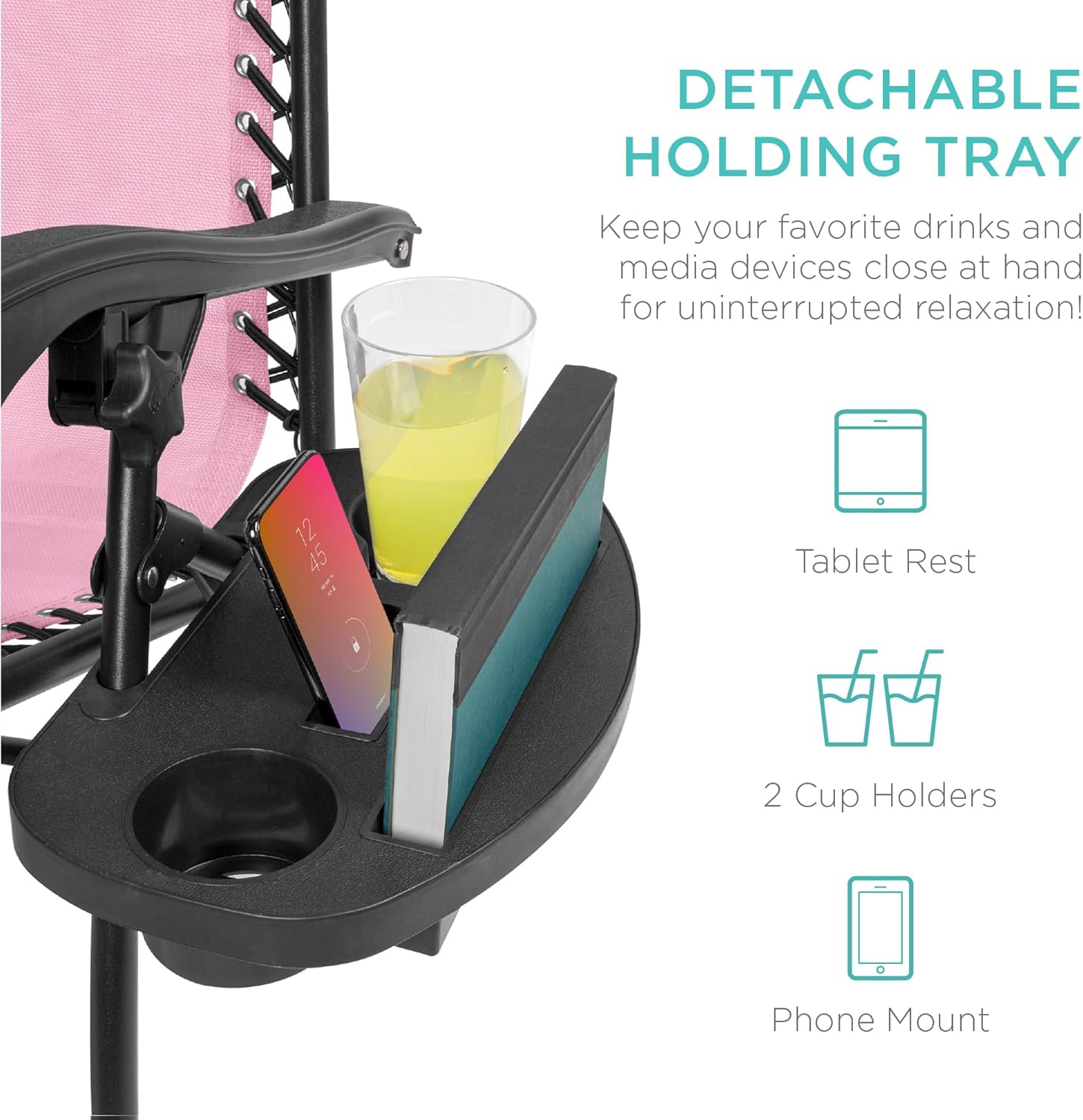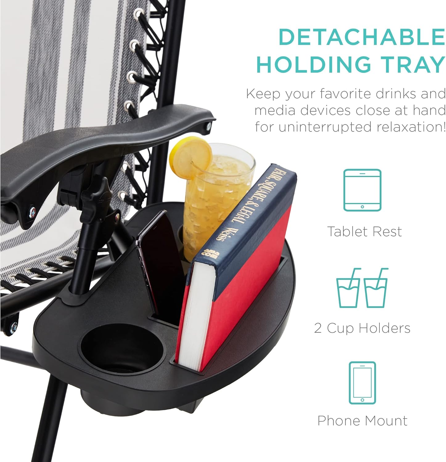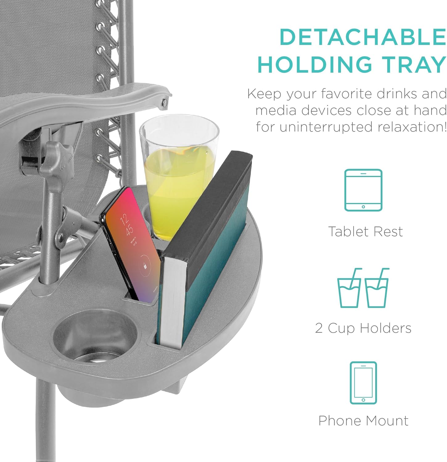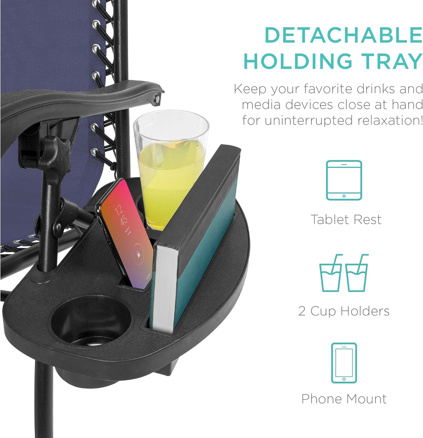 CONVENIENT & DETACHABLE TRAY: Removable tray is built with two cup holders, a phone holder, and a tablet holder so you never have to be far from your favorite drinks or media devices!