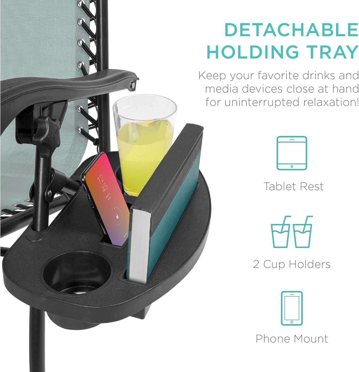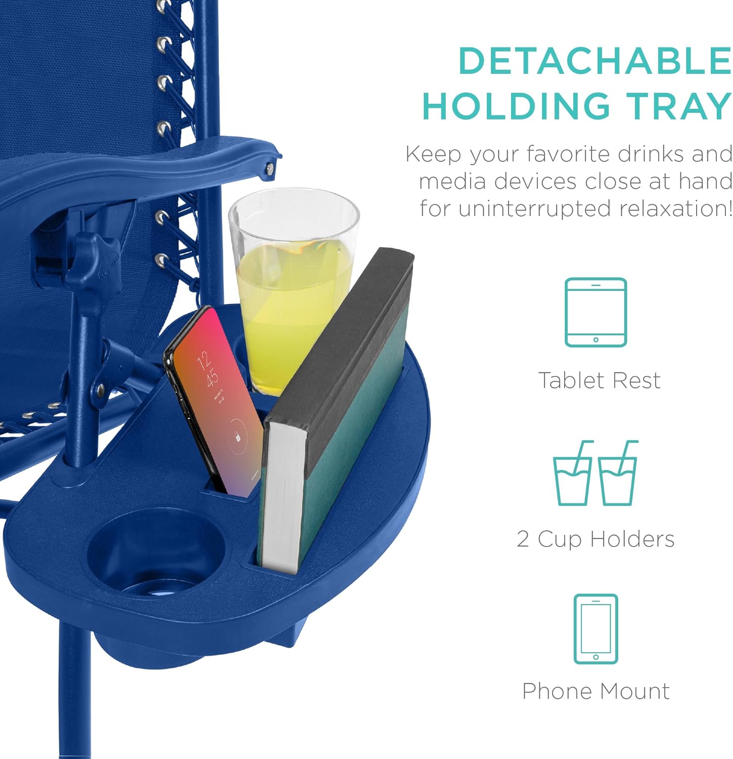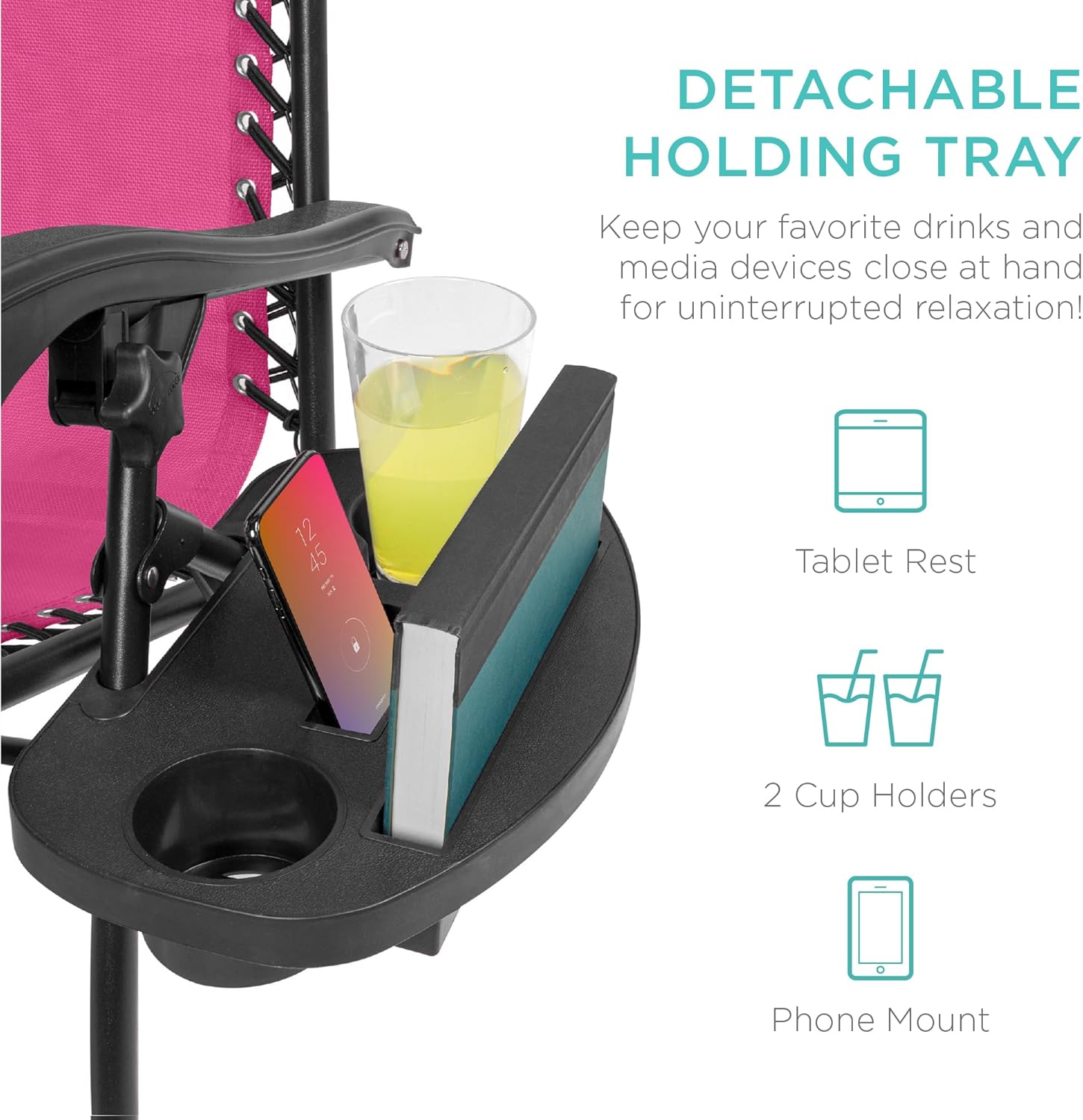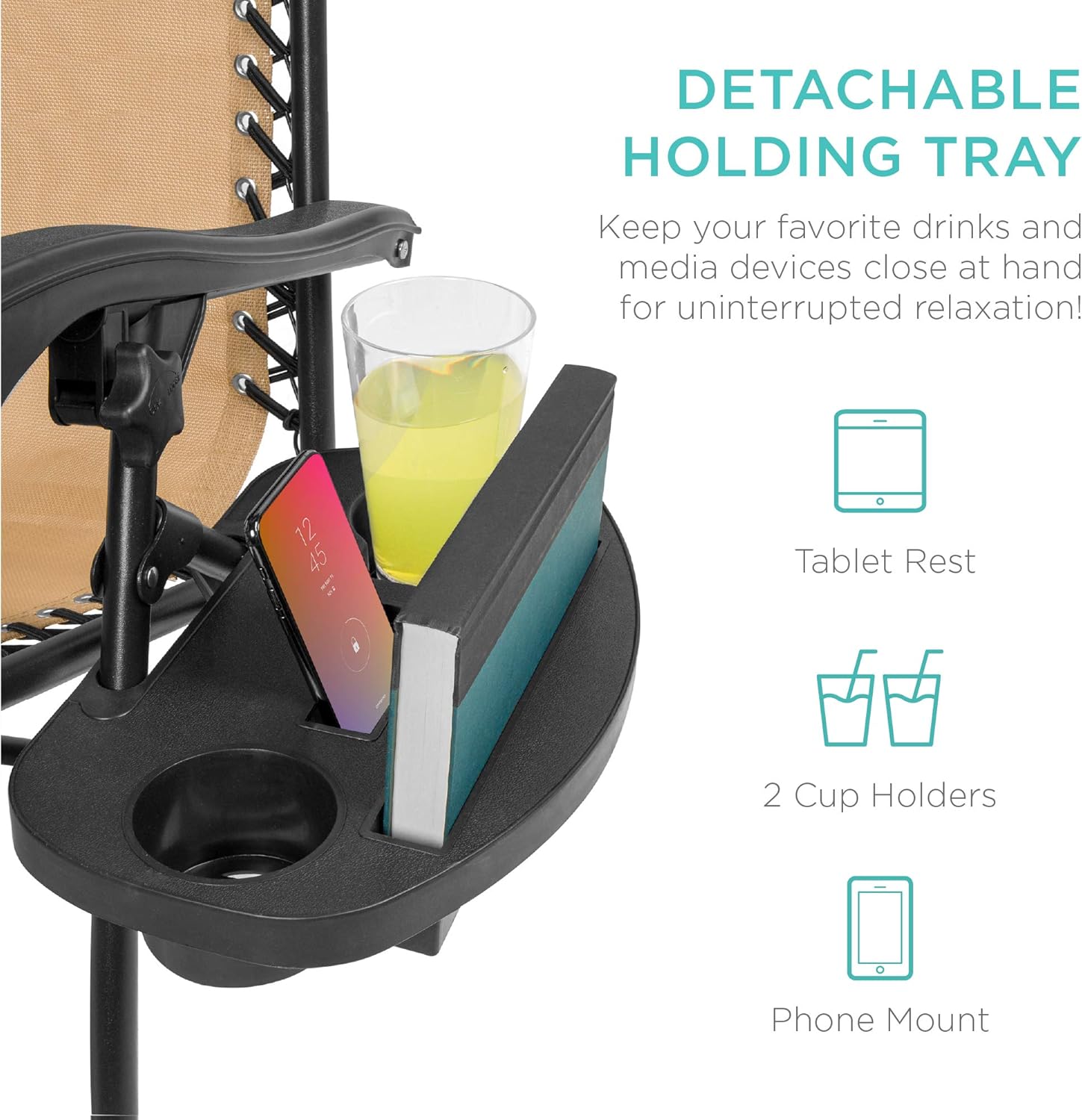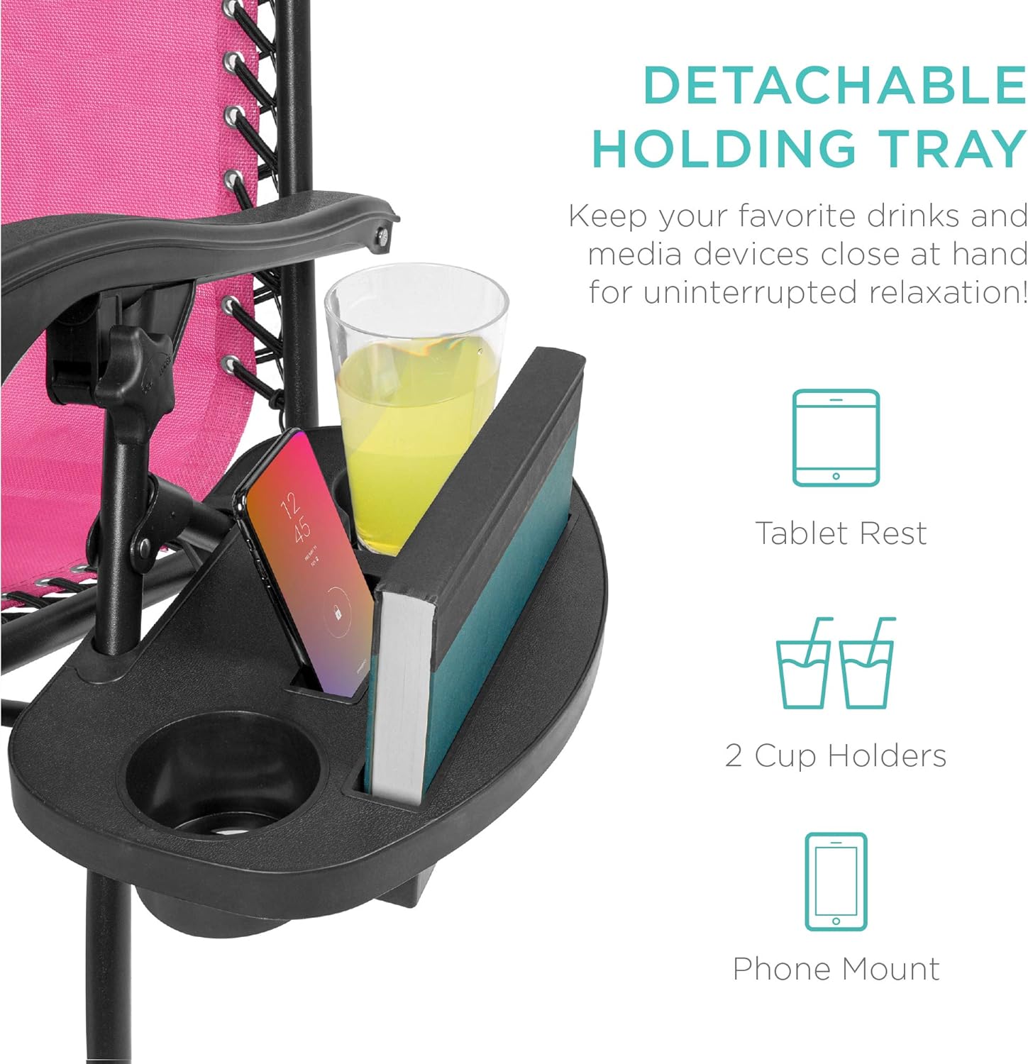 CONVENIENT & DETACHABLE TRAY: Removable tray is built with two cup holders, a phone holder, and a tablet holder so you never have to be far from your favorite drinks or media devices!