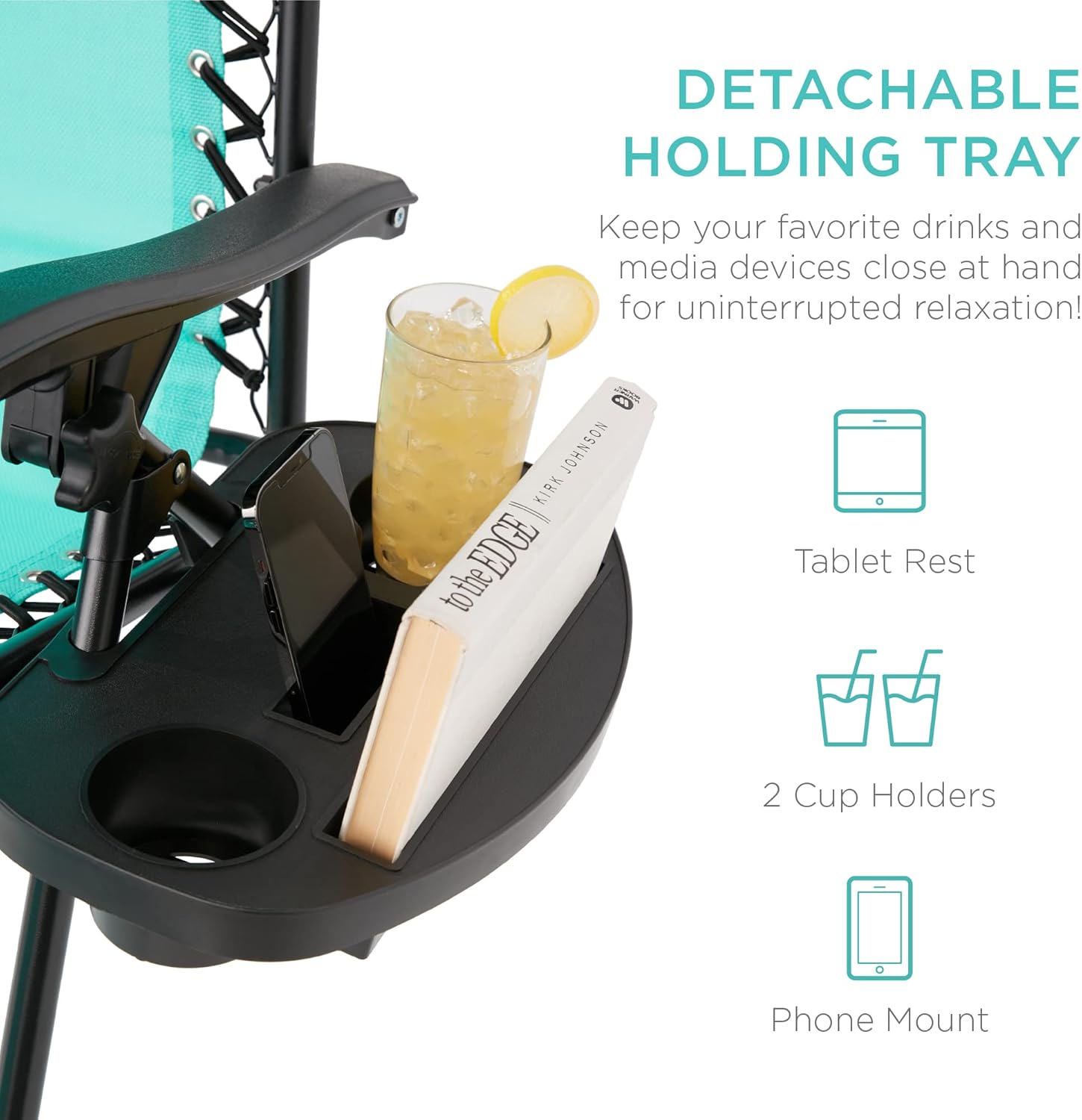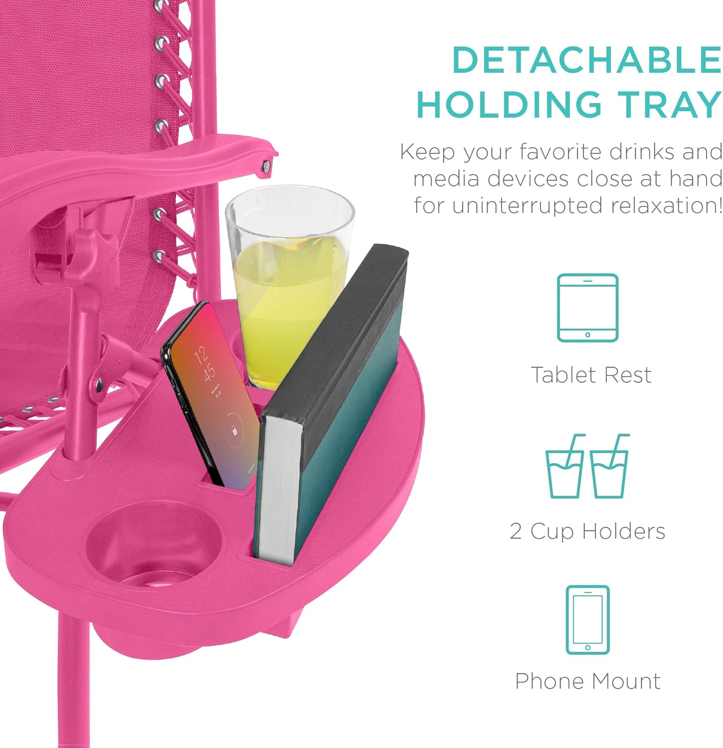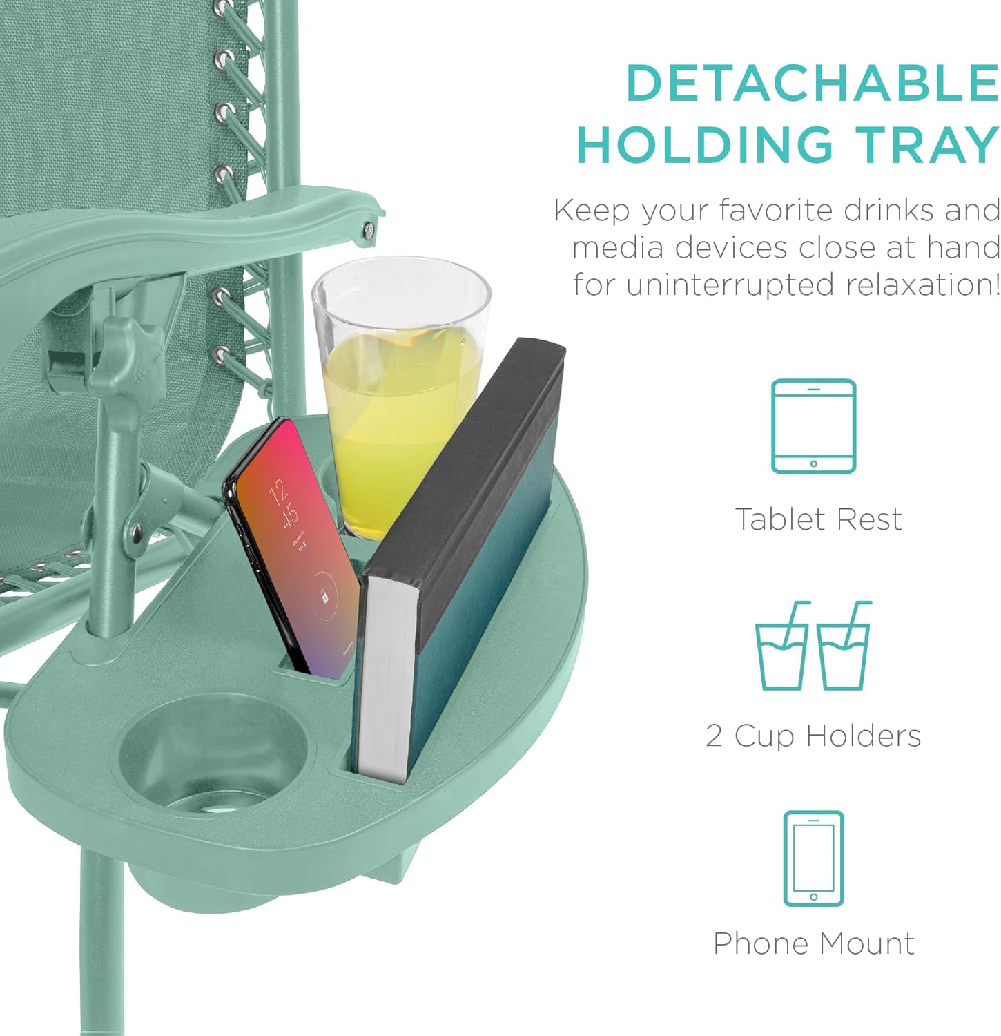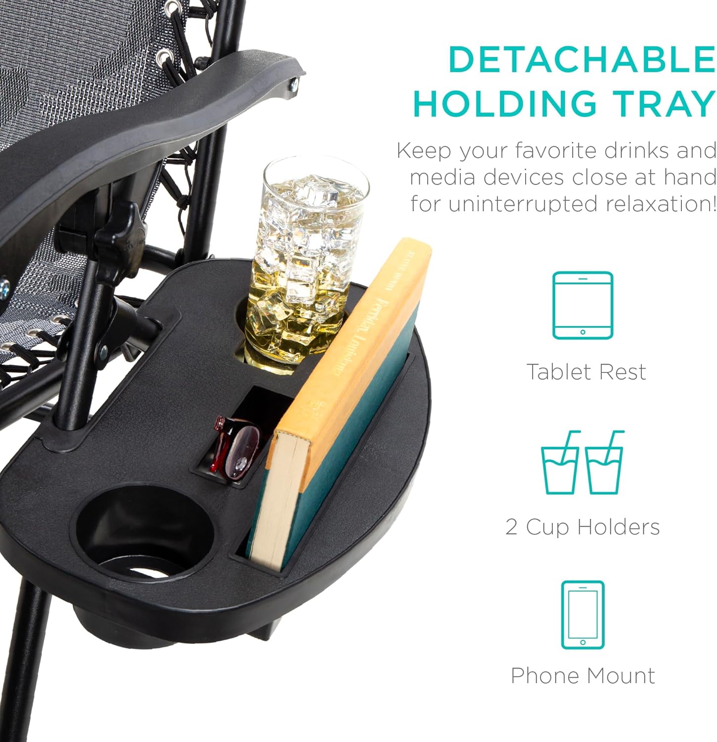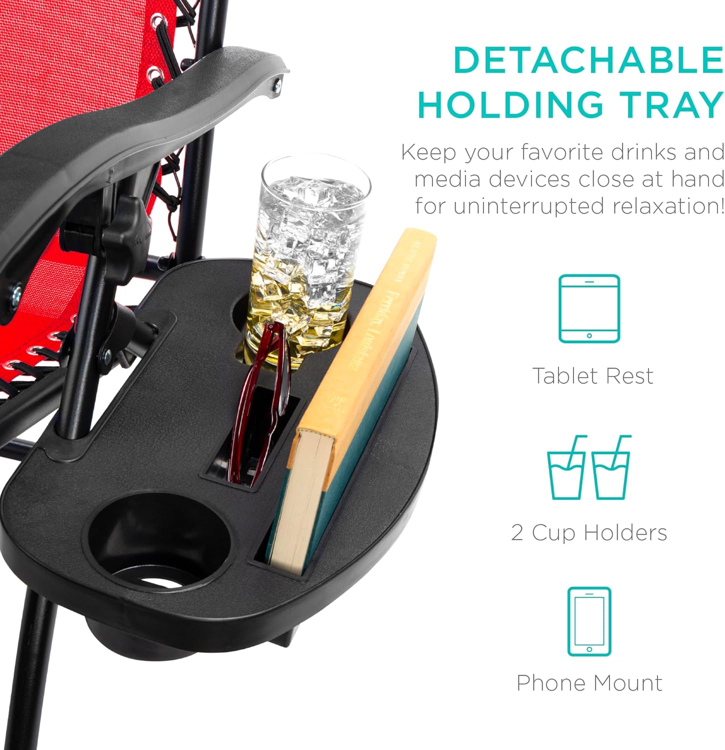 CONVENIENT & DETACHABLE TRAY: Removable tray is built with two cup holders, a phone holder, and a tablet holder so you never have to be far from your favorite drinks or media devices!